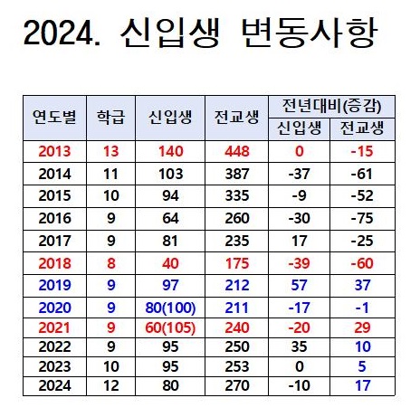 신입생 40명, 전체학급 8반으로 줄었던 (13반에서)