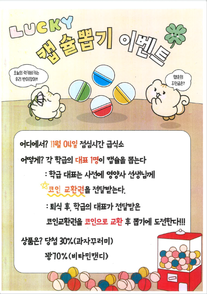 11월 4일 급식소 앞에서 점심시간에 영양사님께 받은 코인 교환권을 코인으로 교환 후 뽑기에 도전하였습니다.