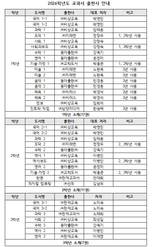 2026학년도 교과서 출판사 안내